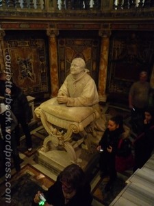The stairs leading down to the crypt shows the statue of Pope Sixtus V